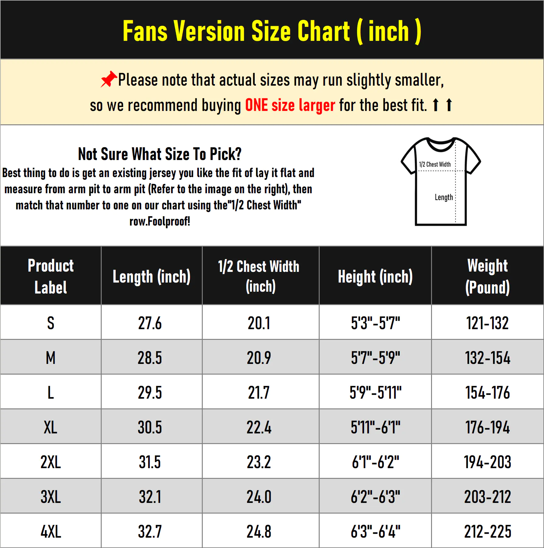 Please note that due to measurement errors, there may be a 1-2 inch discrepancy between the actual jersey size and the size chart, which is considered normal. If your measurements fall between two sizes or if you are overweight or have a muscular build, we highly recommend purchasing a larger size to ensure a more comfortable fit and better wearing experience.